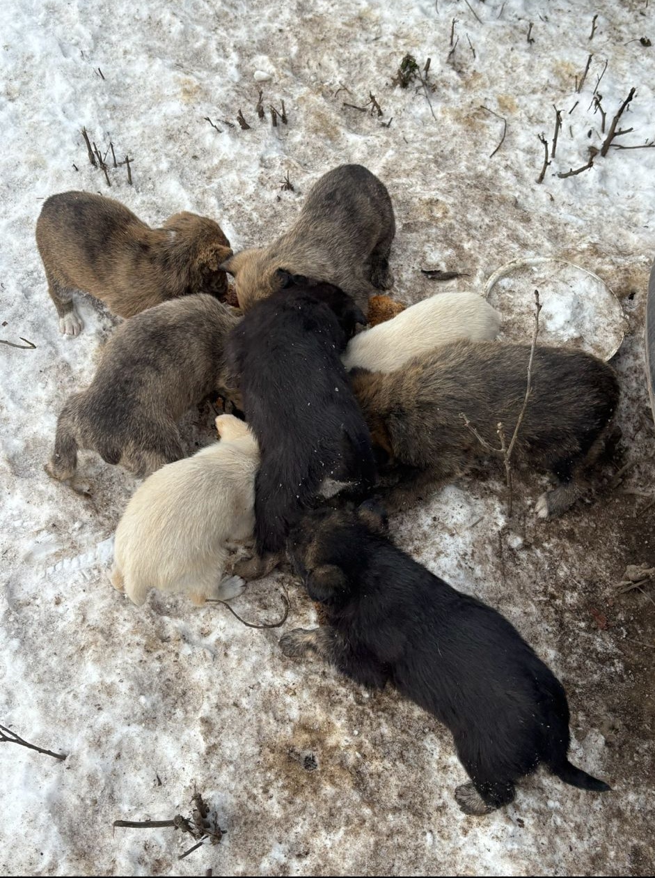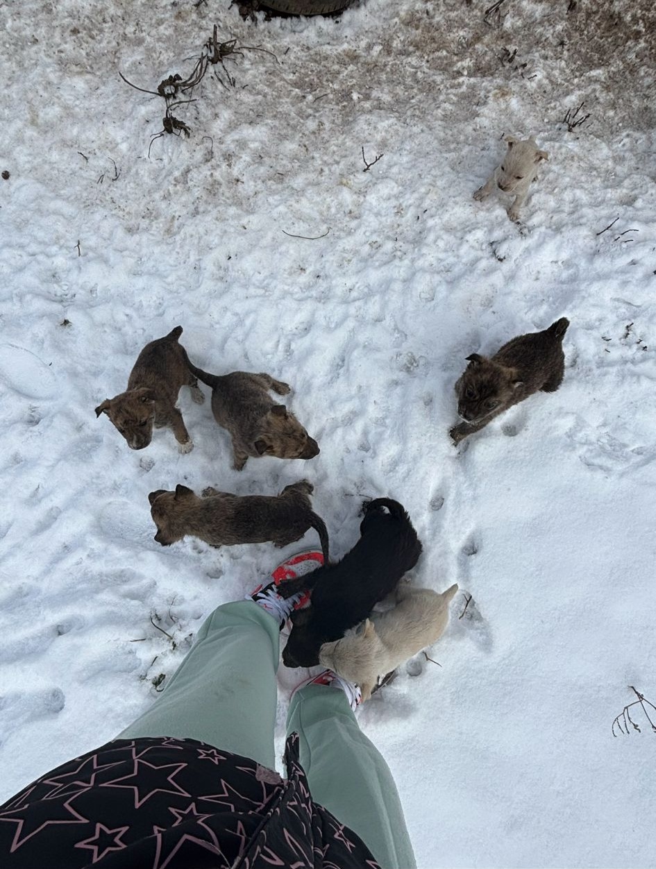 Într-o zi rece de iarnă, am primit un mesaj din județul Călărași. Cineva ne ruga să intervenim pentru o cățelușă care își crescuse puii chiar în zăpadă. Ne-au fost trimise câteva fotografii care ne-au strâns inima: o mămică slabă, tremurândă, alăptând opt ghemotoace fragile direct în zăpadă..