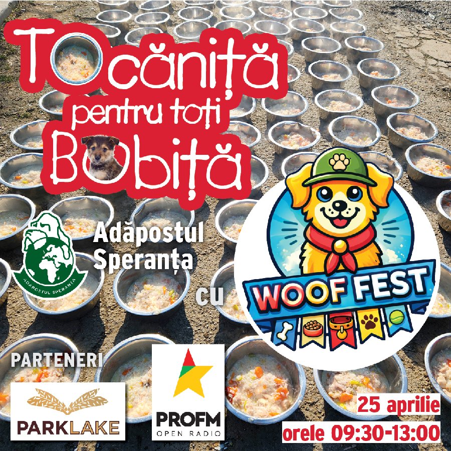 Adăpostul Speranța își invită comunitatea de susținători sâmbătă, 25 aprilie, între orele 09:30 și 13:00, la o nouă ediție a seriei „Tocăniță pentru toți Bobiță”. Evenimentul aduce împreună prieteni, adoptatori și voluntari, alături de invitați speciali precum Woof Fest, ProFM și ParkLake.